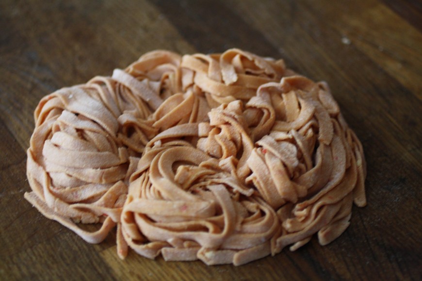 Kavla ut en tunn 1mm. och ca 11 cm bred tunga och kör den i pastamaskinen direkt i valsen för fettucine. Tungan kan också delas på mitten innan. Sidorna behöver inte jämnas, det blir bra ändå.