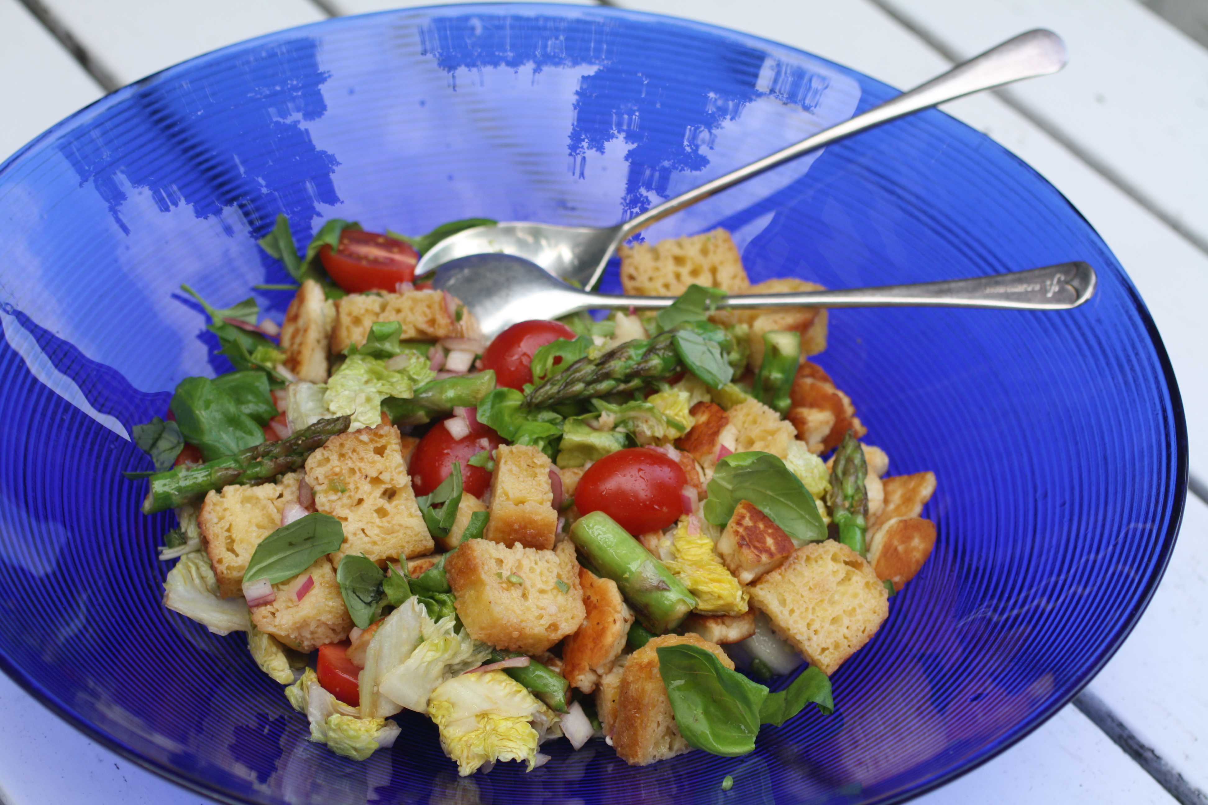 Underbart gott skulle jag säga i alla fall. Ett riktigt gott bröd och krispiga sparrissknoppar med lite gnisslig och frasstekt halloumi blandat med olivolja och rödvinsvinäger blir kronan på verket till sommarens grillmåltid. Tricket med salladen är att få till vinegrett såsen bra och i lagom mängd till brödet, där kan man få känna sig fram lite grann och pytsa ut i omgångar beroende på hur brödet tar upp vätskan. Alla brödbitarna ska vara fuktiga och inte torra. Grönsakerna avger också vätska till salladen. Lite svarta kalamataoliver i gör salladen ännu vackrare och godare men det tänkte jag inte på förrän nu i efterhand, så det ska jag ha i nästa gång. Man kan även tänka sig att byta ut rödvinsvinägern mot citron tror jag!
