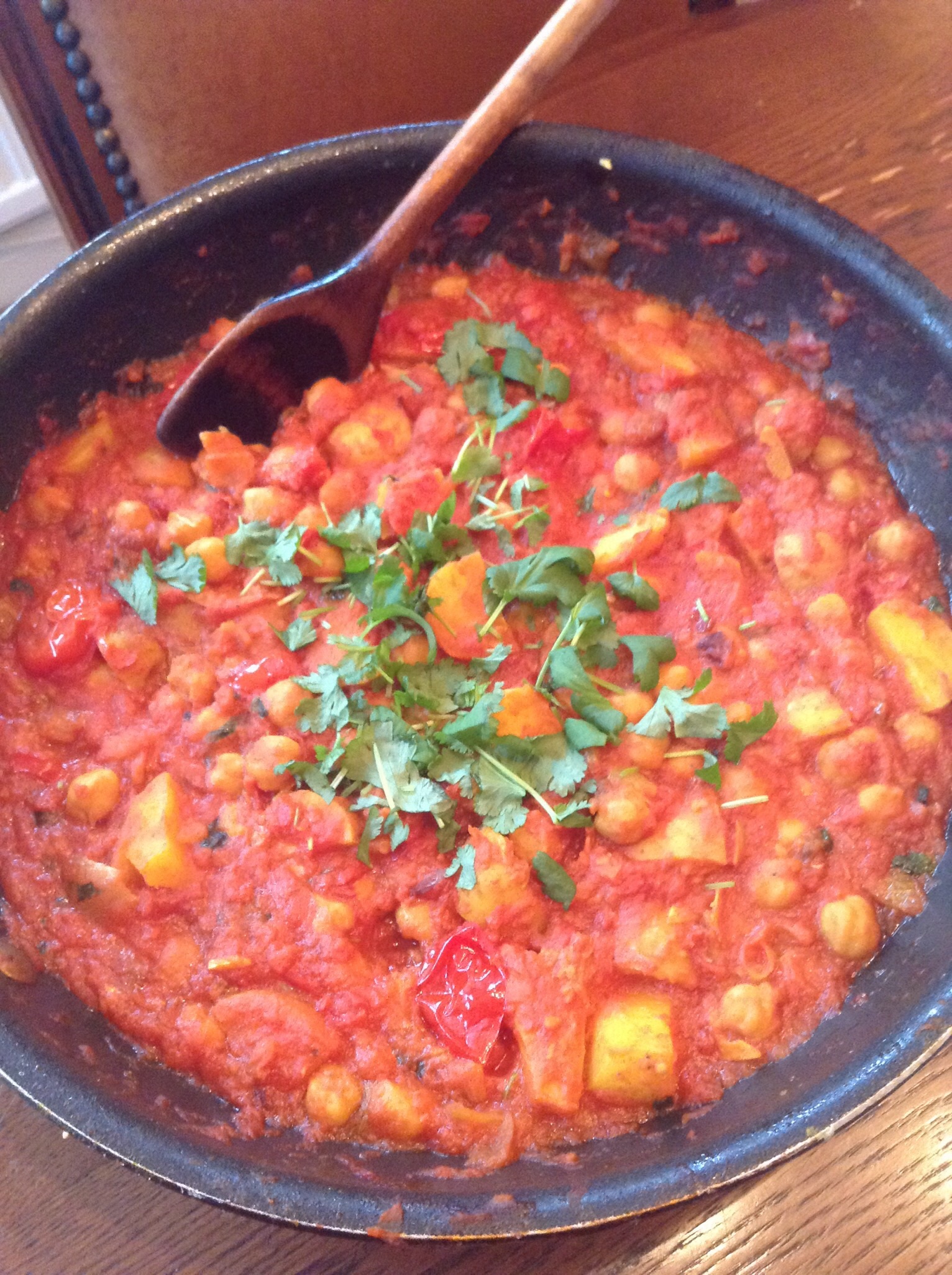 Lägg i resten av ingredienserna utom koriandern. Sjud curryn tills potatisen är mjuk.