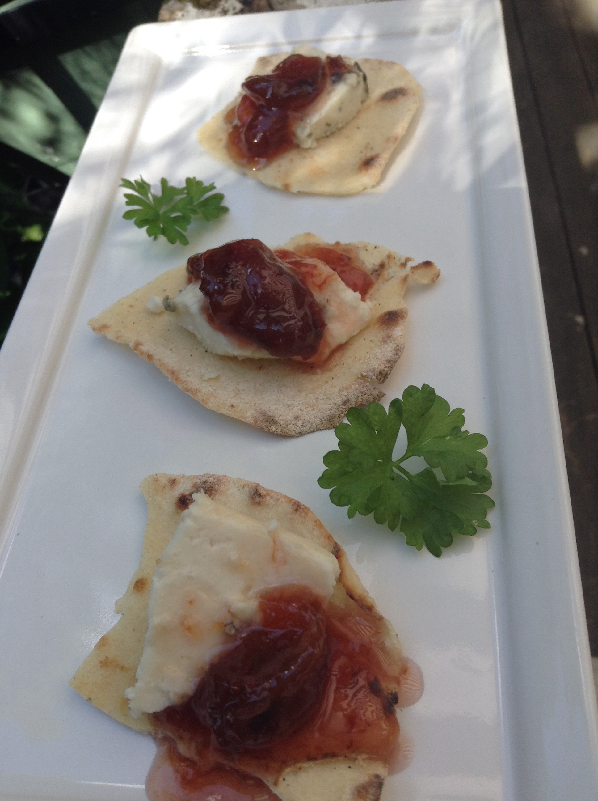 På det hembakade tunnbrödet ligger getädel och en getost med nässlor i. Den hade en ton av kantarell i osten som jag gillade. Till det så ligger lite hemkokt plommonmarmelad med en hint av lakrits. Recept finns på bloggen, likaså recept på glutenfritt tunnbröd. I år ville vissa tunnbröd bli lite mjuka men då kan man torka dem i 50 gradig ugnsvärme. Det är också viktigt att göra dem riktigt tunna. En del av degen fick vila till nästa dag och då hade smakerna utvecklats i brödet. Jag naggar dem också med en sticka före gräddning. I stället för bakpulver kan man ta lite jäst och färsk surdeg i för den som vill det då blir de ännu godare tack vare jäsningen.