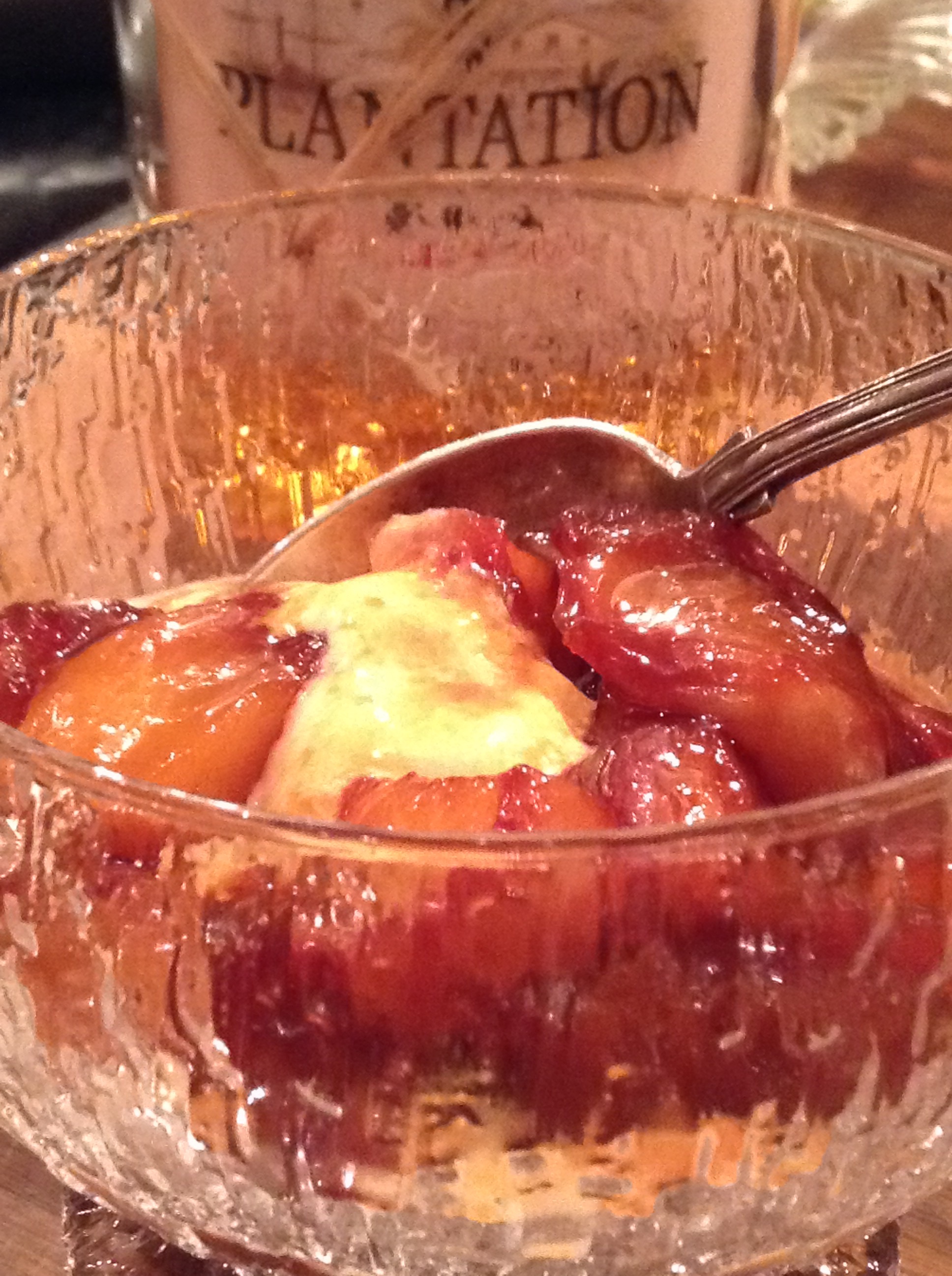 Det här är riktigt smaskiga grejer! Ljuvliga persikor i en härlig karamellsås spetsad med Plantation rom. Det som gör den här rommen så god är att den har smak av arrak och vanilj. Som gör sej så bra till den här kombinationen. Nu finns det mycket god frukt att välja på. Att handla frukt och grönt på torget är härligt för sinnet, särskilt sådana här sköna soliga dagar som vi har nu.